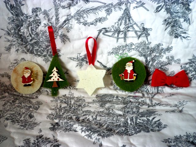 Pour la feutrine, tout dépendra de votre dextérité et de l’âge de votre enfant. Maya n’ayant que trois ans, le découpage des formes et la couture des rubans me sont revenus, mais c’est elle qui a choisi et tracé les formes avec mon aide (si vous avez des emporte-pièces pour faire des biscuits de noël, suivez leur contour intérieur). Nous avions acheté des petits sujets peints en bois qu’elle a collés, puis elle a ajouté sa petite touche personnelle : un peu de paillettes dorées. Le noeud rouge est réalisé avec une simple bande de feutrine.