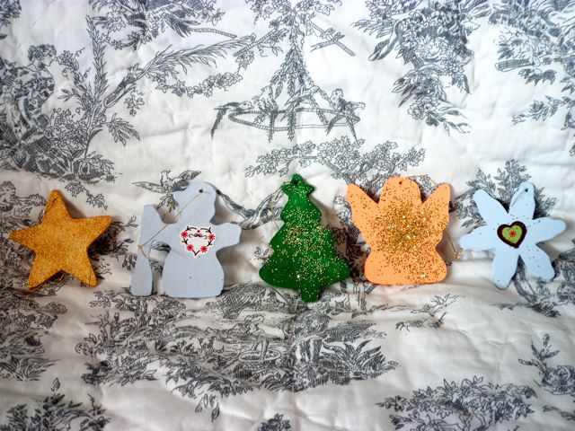 Chez nous, elles seront en polystyrène en raison d’une rupture de stock, mais je vous conseille plutôt une version en papier mâché, plus écologique. Il vous faudra deux couches de peinture et beaucoup de paillettes. Pour les peindre plus facilement, plantez-y un cure-dent ou une punaise avec un embout pour permettre aux petites mains de les tenir, et prévoyez un endroit pour les faire sécher (suspendues de préférence). Un nuage de laque pour cheveux pour fixer les paillettes, et voilà le résultat :