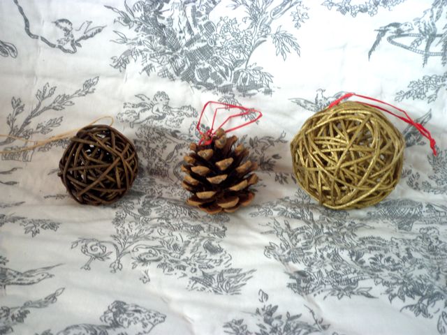 Enfin pensez à tout ce qui traîne dans la maison et qui peut se transformer en décorations de sapin, comme les pommes de pin ramassées à l’automne ou les boules en rotin des pots pourris : un morceau de raphia, un pshit de bombe dorée et les voilà transfigurées.