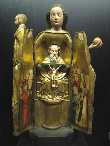 La question de la nature divine de Jésus renvoie à celle de la Paternité de Dieu. C’est à cette question que tente de répondre une série de Vierges ouvrantes abritant en leur sein une représentation de Dieu le Père tenant le Christ en croix. Le sens de ces groupes est à chercher dans les écrits d’un théologien allemand, Johannes Marienwerder, qui évoque la naissance de Jésus par le Père sans la Mère et par la Mère sans le Père (si Jésus est le fils de Dieu, il n’a pas de mère, s’il est le fils de Marie, il n’a pas de père, s’il est Dieu, il n’a ni père ni mère). C’est donc bien la paternité, ainsi que la maternité, qui sont au cœur de la réflexion qui a présidé à la réalisation des ces œuvres.